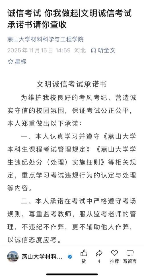 为营造公平公正的考试环境,强化学生诚信意识,近日,材料科学与工程学院围绕“严肃考风考纪、深化诚信教育”主题,开展系列教育活动,以制度约束为保障、以思想引领为核心,推动诚信考试理念深入人心,筑牢校园学风建设“防火墙”。