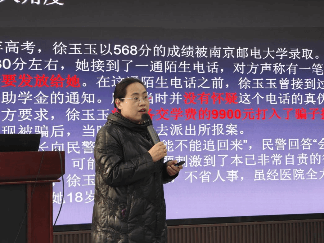 讲座中,高律师以徐玉玉被诈骗案为切入点,详细剖析了电信网络诈骗的严重危害,结合真实案例揭示了骗子利用公民个人信息实施诈骗的完整链条,并针对学生群体特点,重点解读了兼职刷单返利、校园贷、网络交友三类高发骗局的核心套路。
