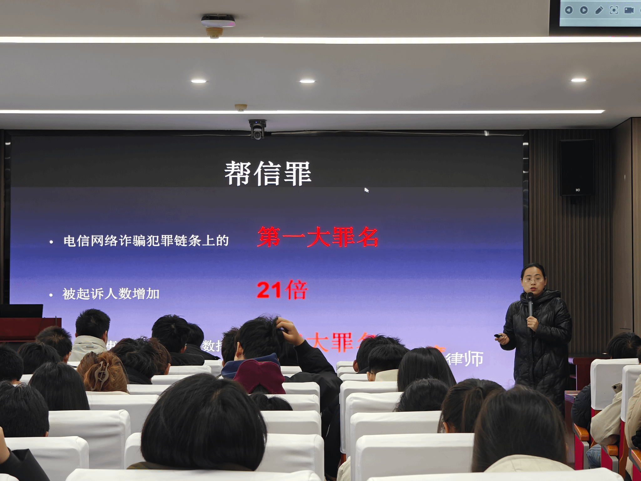 值得关注的是,高律师特别强调了“帮信罪”的法律风险。目前,帮助信息网络犯罪活动罪已成为电信网络诈骗犯罪链条上的第一大罪名,她结合多起高校学生涉案案例,解读了《刑法》相关条款,提醒学生切勿因贪图小利,而成为电信诈骗的“工具人”,触犯法律红线。