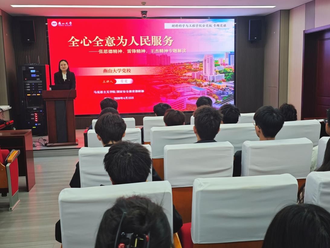 为深化学生党员党性教育,厚植为人民服务的宗旨意识,4月15日晚18时,材料科学与工程学院分党校邀请马克思主义学院雷霆老师在学院行政楼113会议室开展主题为《全心全意为人民服务——张思德精神、雷锋精神、王杰精神专题解读》专题党课,学院21名学生党员和25名发展对象参与学习。